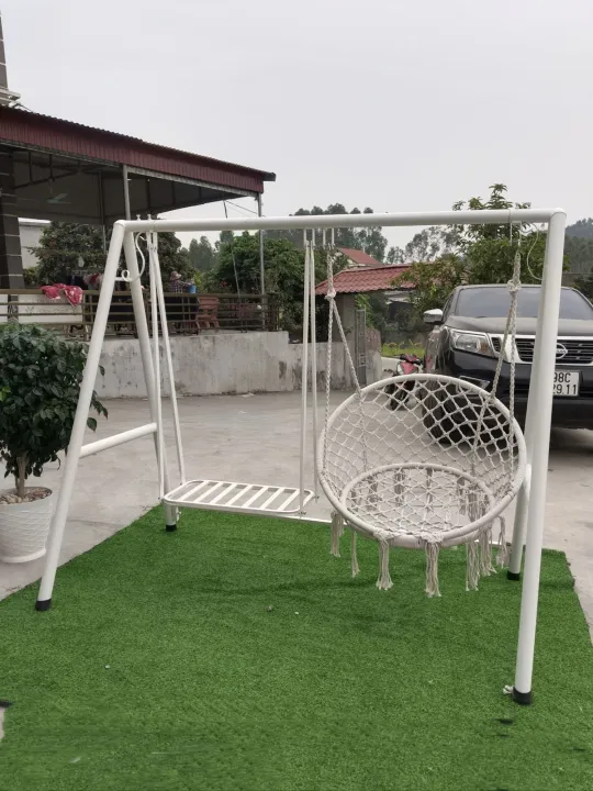 ghế xích đu một bên được làm từ sắt còn ghế tròn được làm từ sợi cắt tông